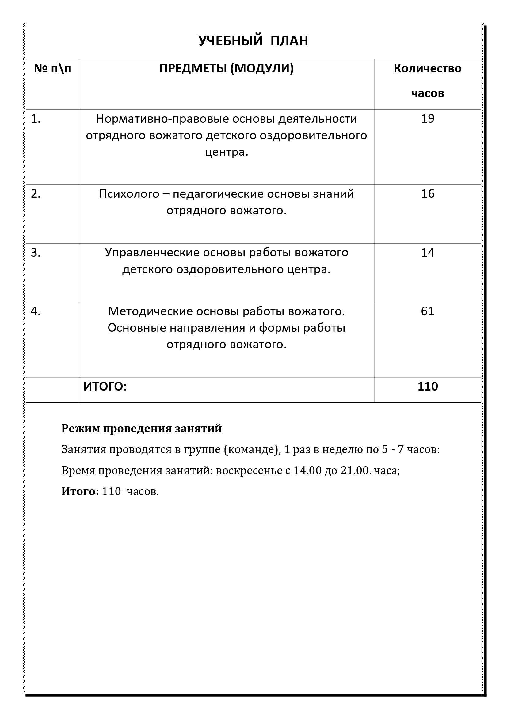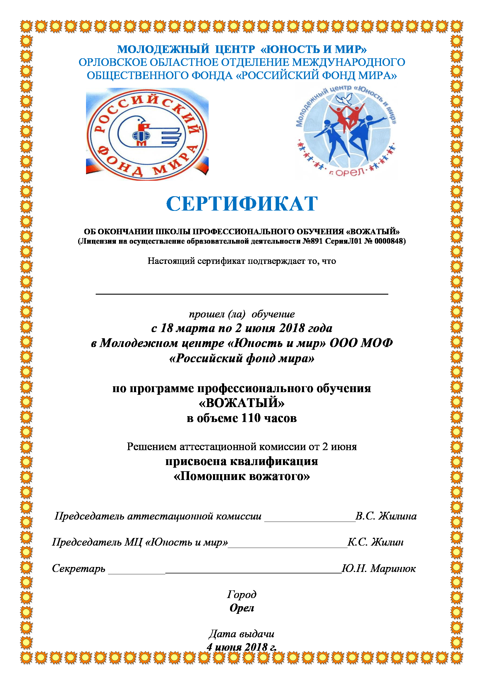 По окончанию курса в 110 часов теоретических и практических занятий обучающимся вручается Свидетельство о получении профессии "Вожатый". Слушателям, не достигшим совершеннолетия по окончании обучения выдается Сертификат "Помощник вожатого", который при достижении 18-летнего возраста подлежит обмену на Свидетельство о присвоении профессии "Вожатый". А обучение и совершеннолетние слушатели и те, кто не достиг этого возраста, проходят обучение вместе по одной и той же программе. На данном этапе развития школы идет разработка программы подготовки старших вожатых, педагогов - организаторов. Т.о. мы принимаем в школу молодых людей в возрасте от 16 до 30 лет. Все слушатели, успешно окончившие обучение обеспечиваются интересной работой в детских центрах как Орловской области, так и других регионов России, а, главное, в Международном Лагере мира!!!